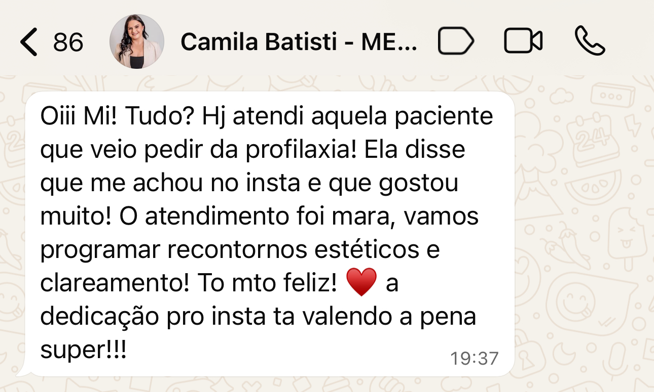 Sou Michelle Ramos, cirurgiã-dentista trabalho na área da Odontologia Preventiva e Estética. Assim como muitos, comecei na profissão sem saber para onde ir, trabalhando em convênios que pagavam pouco, alugando sala sem pacientes. Percebi que precisava mudar e entrei em uma clínica popular, onde atendia muito e me sentia desvalorizada, mas usei esse tempo para me preparar: organizei meu Instagram, criei conteúdos e defini estratégias para atrair meus próprios pacientes.